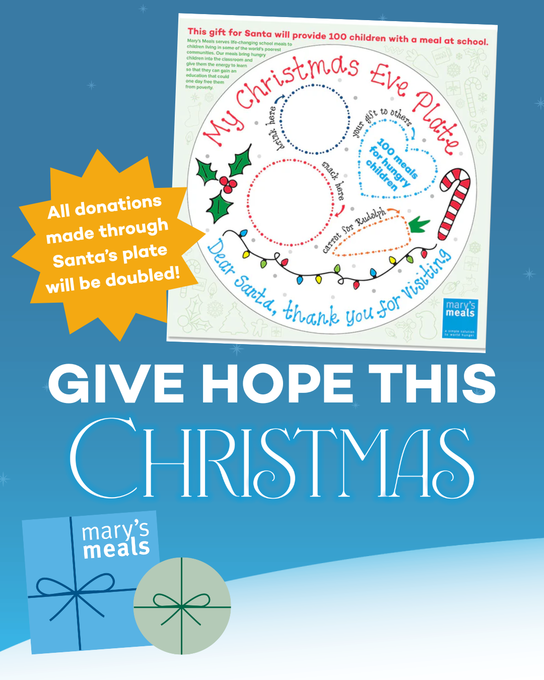 A perfect gift for little ones and a powerful way to help children in some of the world’s poorest communities. For a £10 donation, which provides 100 school meals, supporters will receive a beautiful Santa plate gift card to decorate and leave out for Santa to deliver to hungry children around the world on Christmas Eve.